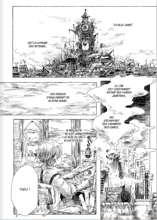 Résumé : A la rencontre de Théo, un jeune garçon qui travaille au sein de l’atelier de réparation de M. Chikuwa, dans la ville jaune polluée par ses usines qui rejettent d’épais nuages qui cachent le ciel et les étoiles.