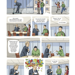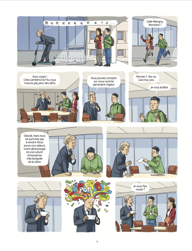 Critique : Le récit dévoile le monde de l’entreprise lorsqu’une PME française se fait racheter par une start-up américaine, qui va tenter d’y implanter ses méthodes de travail. Il s’agit de dénoncer les abus du monde de l’entreprise ainsi que le choc des cultures à travers deux approches qui ont du mal à s’entendre, la petite PME familiale et la start-up américaine aux ambitions mondiales, le tout avec humour. Eric Tartrais joue sur les gags, le comique de situation, parfois, il pousse les situations jusqu’à créer des moments absurdes. Il utilise aussi les références discrètes dans l’image, comme cette réunion de bureau qui reproduit le tableau de la cène.