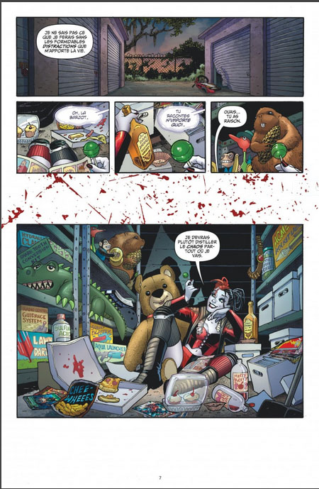 L’histoire en elle-même est prétexte au grand délire scénaristique, et le but n’est pas tant de créer une tension dramatique que de partir dans des grosses blagues. Harley fait du roller derby, Harley pourchassé par des tueurs à gages, Harley adopte un chien, Harley et Ivy poison vont à la plage etc...Un fil rouge se déclare au fur et à mesure (avec ces tueurs qui veulent sa tête, pourquoi ? Qui les emploie ?). Cet arc trouve sa résolution dans le dernier chapitre du recueil, qui ouvre sur de nouvelles intrigues pour les tomes à venir. Notons que la résolution est aussi délirante que l’ambiance de la BD, la ligne est tenue.