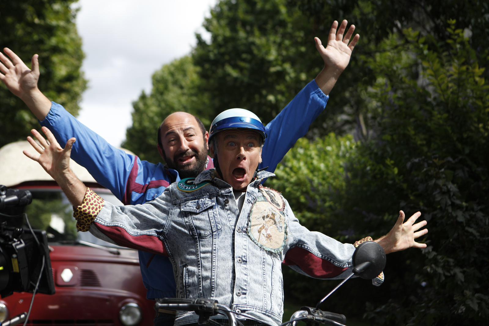 Après ce raisonnement chiffré quelque peu rocambolesque, il est cependant clair que Dominique Farrugia s’est englué dans un type de cinéma qui respecte des normes qu’il semble lui-même avoir étiquetées, avec des acteurs plébiscités par un public de moins en moins exigeant. Loin de nous l’idée de douter du talent d’humoriste de l’ami Franck ou de Kad (puisque tout le monde les appelle par leur prénom). Mais n’est-il pas gênant d’entendre de la bouche de milliers d’ados et d’adultes : « Je vais voir le nouveau Kad ou le nouveau Dubosc », comme si la seule évocation de leur nom suffisait à rendre le film poilant ? Ce phénomène ne fait que renforcer un manque d’originalité scénaristique érigé en vertu pour minimiser les risques. Les schémas, les structures, se voient de plus en plus simplifiés afin de satisfaire au plus grand nombre, transformant le public en masse bovine prête à être gavée d’images clichés qui nourrissent des représentations attendues de tous. Ainsi, lorsque l’on voit les fesses de Dubosc après qu’il se soit réveillé entièrement nu en 1986, c’est la scène du slip kangourou de Camping qui se rejoue sous nos yeux. Si ce recours à l’autoparodie, qui culmine lorsque les deux compères pastichent la plus célèbre scène des Ch’tis, n’est pas déplaisant et donne naissance aux séquences les plus drôles du film, il n’en est pas moins symptomatique de la vacuité du discours de Dominique Farrugia.