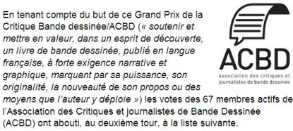 Mais imaginons que notre non-lecteur lambda habite en plein désert creusois et que tous ses amis sont partis (re)trouver la civilisation. Que fait-il ? Et bien, il va chercher les listes des grand prix pour piocher dedans ! Ne vous moquez pas, que celui qui n’a pas fait l’erreur avec un Goncourt ou une Palme d’Or me jette le premier Terra Australis (500 pages, ça fait mal). Et comme notre homme (ou notre femme) a décidé de s’investir dans les cases aujourd’hui, il va ouvrir la sélection de l’ACBD.