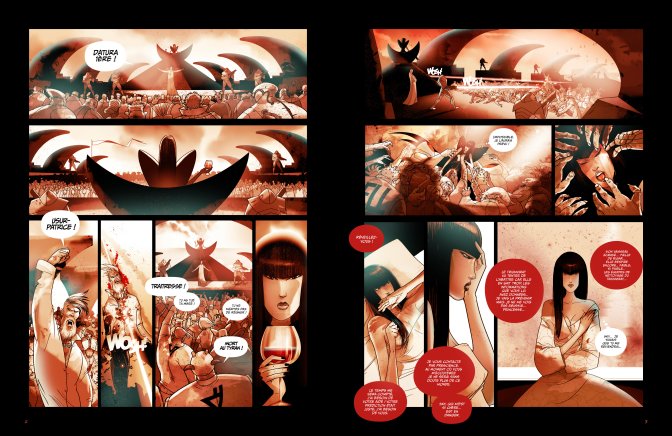 Pour les graphismes, Stéphane Goddard continue de nous bluffer. La finesse et la pureté des lignes, le mouvement des personnages et la profondeur du noir inscrivent le manga dans une modernité affolante. L’auteur va même plus loin puisque après un premier tome aux reflets d’or, celui-ci nous plonge dans des camaïeux de rouge et carmin, reflets de la passion des personnages. On retrouve encore des références aux comics US dans la narration incroyable de certaines pages, où l’action de Sky et de Blackfury se lit en parallèle, l’une dans les cases supérieures de la double page, et l’autre sur celle inférieure.