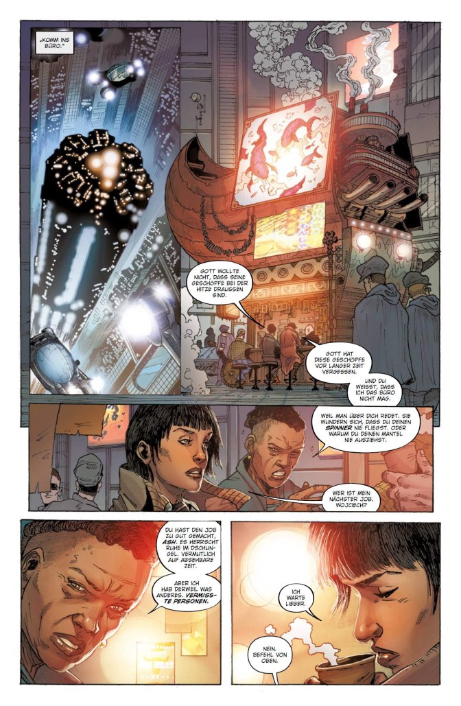 Denis Villeneuve avait réussi à faire une suite sobre et dans l’esprit au cinéma pour Ridley Scott, il était évident que les comics allaient s’engouffrer dans la brèche de Philip K. Dick. Mais, alors qu’on attendait un détour vers 2049, c’est finalement 2019 qui a été choisi. Un choix audacieux à l’époque des rêves des moutons électriques, mais un pari plutôt bien relevé par Mike Johnson et Michael Green. On le sait, ce qui importe dans cet univers, c’est l’ambiance. La pluie perpétuelle, les écriteaux aux lumières rosées, la nourriture asiatique à la sauvette...Tout est coché dès les premières pages, avec en prime le petit plan en élévation au-dessus du building qui a fait l’affiche mythique du premier film. On aurait juré croiser Harrison Ford dans une rue, mais ce sera sûrement pour un prochain tome, qui, au niveau du scénario, aura du mal à suivre la cadence de ce premier, car l’enquête est déjà résolue ! Sans être très complexe, elle a le mérite de donner de l’action de manière assez progressive, montrant une héroïne au corps fragile, pour finir avec l’humanité des androïdes (forcément).