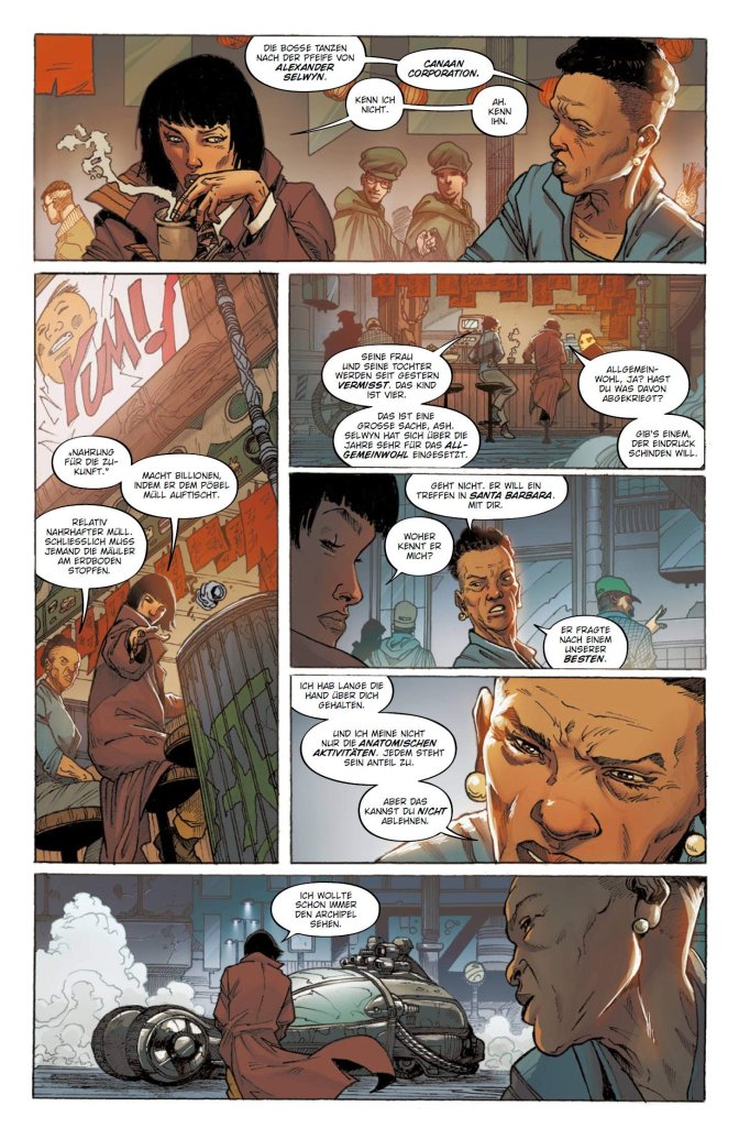 On l’a dit, l’ambiance est la clef de voûte de l’univers Blade Runner. Les éléments attendus au début, auxquels on peut ajouter le poste de police, l’appartement exigu et le riche homme d’affaire, laissent place à des ruelles mais aussi des étendues naturelles, avec notamment une île. Il faut donc le dire, la deuxième moitié du comic manque de cette atmosphère crépusculaire et lancinante que le début avait bien installé. Toutefois, les blessures et les échauffourées participent à augmenter l’adrénaline, comme finalement l’avait aussi pas mal fait le second film. Le bon traitement du personnage principal Ash donne aussi du cran au graphisme, comme une sorte de Ford ou Gosling féminin qui serre les dents mais avec un bon fond.