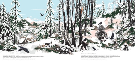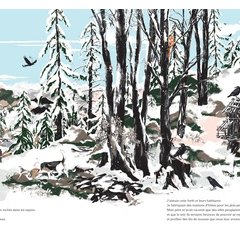 Critique : Stéphane Kiehl nous convie à une promenade dans une forêt enneigée, en plein de cœur de la montagne. Mais le brouillard embrasse vite le garçon et dissimule aussi bien le sentier que ses traces de pas et les habitants de ces terres, les plus inoffensives comme les plus féroces. Pour plonger le lecteur dans cette impression de perdition qui s’empare de l’enfant, l’auteur utilise des calques sur lesquels sont imprimés des fragments de dessins. Ainsi, lorsque le lecteur tourne les pages, le paysage se transforme à travers la transparence des feuilles de papier qui laissent apparaître des portions d’images plus ou moins grisées : l’image évolue constamment et restitue l’émerveillement de découvrir un monde qu’on ne peut que percevoir, qui se meut, dissimule et révèle des particularités de l’environnement, tout comme les animaux de ces bois. Ce panorama mouvant se révèle des plus envoûtants. Il prend vie avec un dessin numérique un peu froid, mais qui incarne particulièrement bien cette histoire où le réalisme se mêle aux mirages fantastiques, qui émergent au sein de pages particulièrement imposantes.