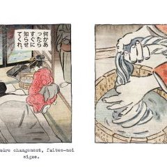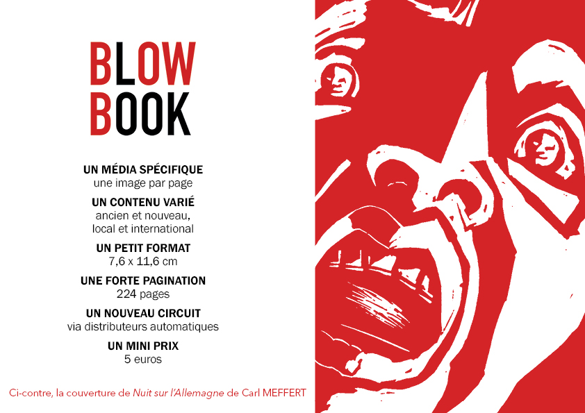 En 2008, lors d’un Salon à Harlem en Hollande, j’ai été en contact avec les « beeldverhalen » d’Alfred Mazure, Dick Bos, créées sous l’Occupation. Nos Blow books sont une résurgence de ce petit format et de son articulation en « une image par page », la double page permettant leur juxtaposition. Le nom Blow Book est le terme anglais pour livre magique : un ouvrage de magicien. Selon l’alignement de ses doigts sur des encoches lors de son feuilletage orienté vers le public, l’ouvrage révélait ou faisait disparaître des figures du livre. On pourrait le placer comme un antécédent à la bande dessinée et au pré-cinéma. C’est aussi parti d’un constat : la bande dessinée en France et en Belgique, depuis son éloignement des périodiques, est devenue très chers. Le format des Blow Books permet de revenir à une forte pagination ( 224 pages) à un prix démocratique (5 €). Assez spontanément, nous avons lancé nos éditions avec une aventure de Dick Bos : « Jiu-Jitsu ».