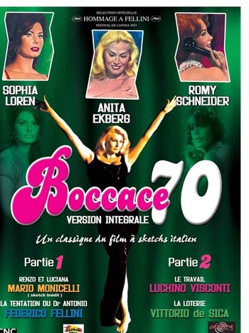 Il ne s’agit pas à proprement parler d’une adaptation du Décaméron de Boccace (1313-1375), fondateur de la littérature en prose italienne. Les quatre histoires qui composent le film s’en sont inspirées dans la veine et l’esprit plutôt que dans la lettre. L’esprit ? Celui du triomphe des appétits terrestres. La veine ? Celle de la satire sociale. Conservatisme et bigoterie sont mis à rude épreuve dans ce Bocacce 70 provocateur qui se moque des travers de l’Italie d’alors. A tel point que ses réalisateurs pensaient qu’ils seraient censurés et que le film ne sortirait pas avant les années 70. D’où le titre.