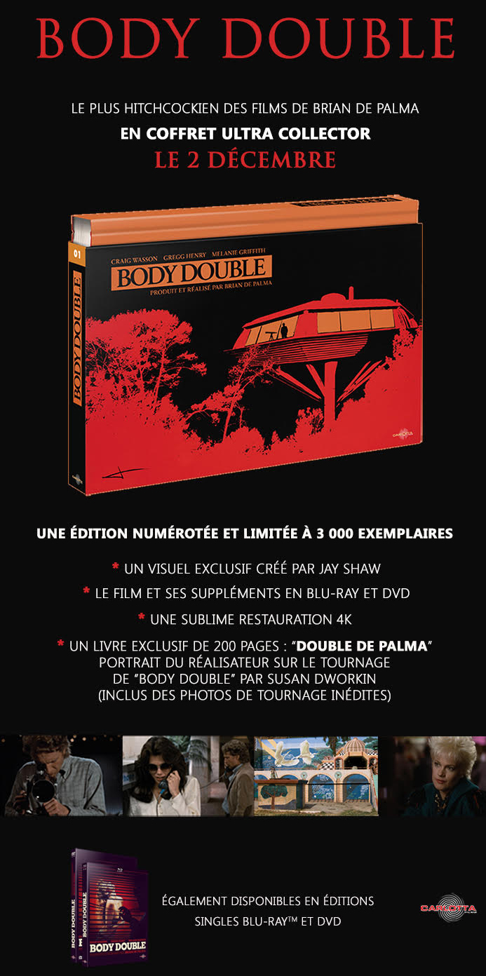 Carlotta inaugure une nouvelle collection cinéphile en fin d’année avec la sortie de Body Double, le 2 décembre prochain, dans un coffret collector limité à 3000 exemplaires. Cette nouvelle collection proposera à chaque fois des coffrets luxueux qui permettront aux amateurs de très beaux objets de fournir un peu plus leurs étagères.
