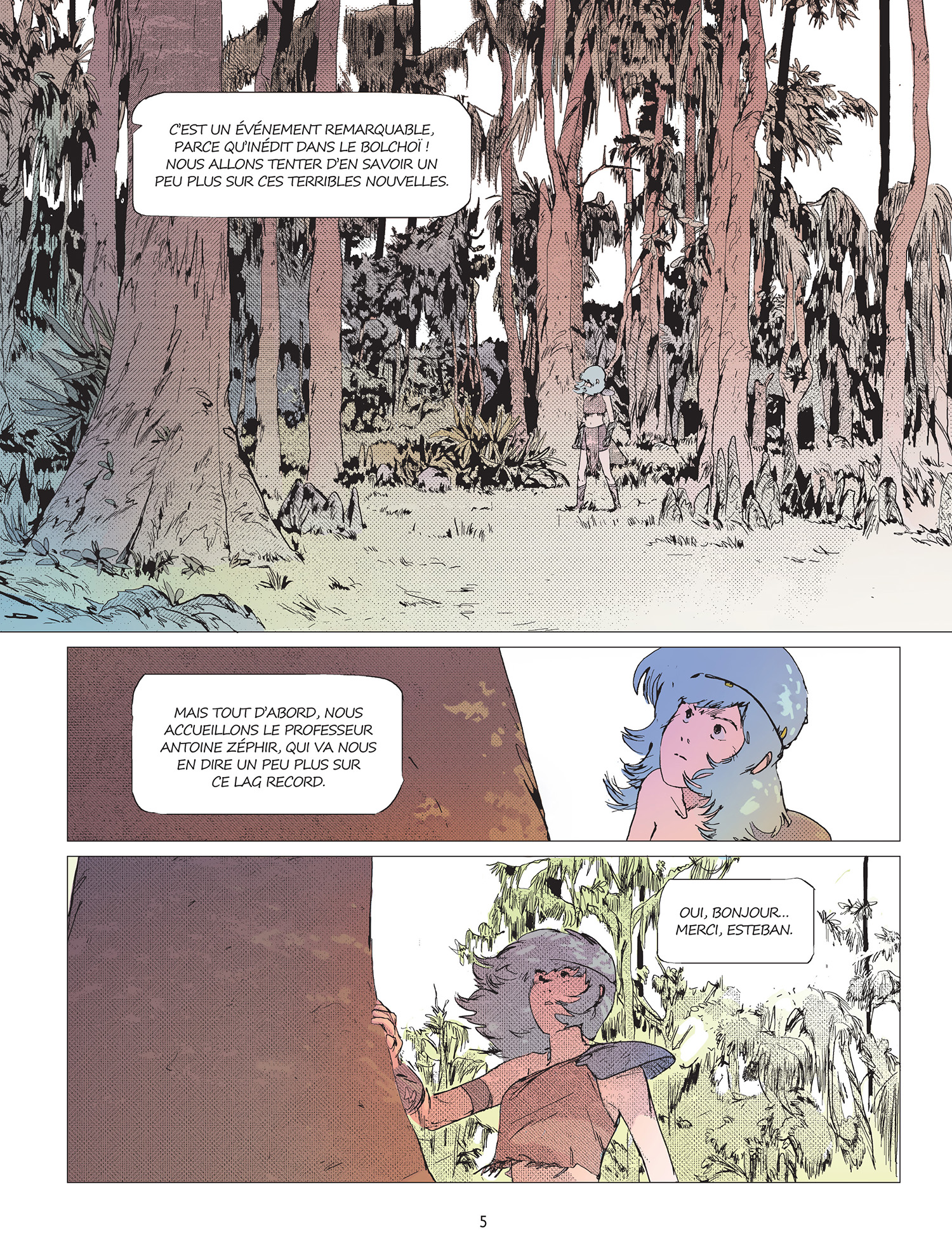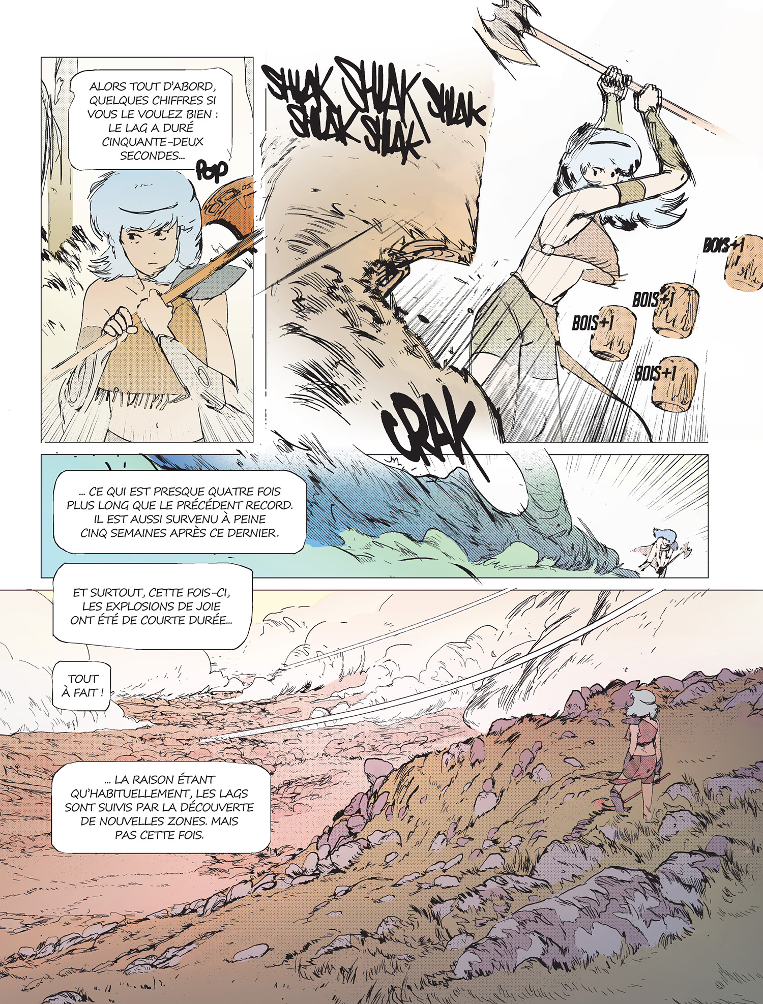 Dans cette sorte d’hommage élégant où Minecraft côtoie No Man’s Sky, le dessin appelle aussi la proximité puisque Boulet et Aseyn ont créé ce monde. Diverses influences, diverses envies ont finalement donné vie à un monde protéiforme, d’un côté virtuel où les vaisseaux spatiaux se posent sur des bases minières, et d’un autre, le monde réel prend des allures d’hôpital du futur, mais saisissant de réalisme. Mais le style ne différencie finalement pas totalement les deux, les personnages se fondant dans l’un comme dans l’autre.