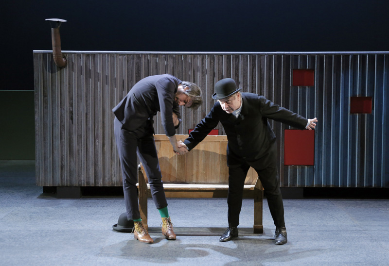 Dans la famille Deschamps, le fils scénographe divise dans sa profondeur la scène pourtant peu profonde de l’espace Cardin, en installant un long container de métal. On l’imagine parfaitement dans la cour de la ferme que nos deux aventuriers du terroir acquièrent pour renouer avec l’authenticité de la nature. Apparaissant et disparaissant à la manière de guignol, ils font les pitres émaillant leurs numéros de phrases bien tournées de notre champion de la littérature 19ème.