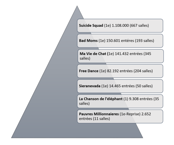 Suicide Squad, massacré par la critique lors du jour de sa sortie, profite d’un teasing internet monumental et d’une semaine sans aucune nouveauté d’envergure pour s’asseoir au sommet, mais, avec 1.108.000 entrées, le film de super-vilains de Warner a beau cumuler 1.662 entrées par salle, il ne réalise à peine que 20.000 entrées de plus que Comme des Bêtes, sorti une semaine auparavant. La différence est que le second est armé pour survivre, Suicide Squad, lui, est prêt à dégringoler (-76% pour son second mercredi sur Paris), victime d’un bad buzz post sorti rare. Bref, personne n’est impressionné par un produit de marketing vu par beaucoup par dépit et dont on attendait un final autour des 4 millions d’entrées.