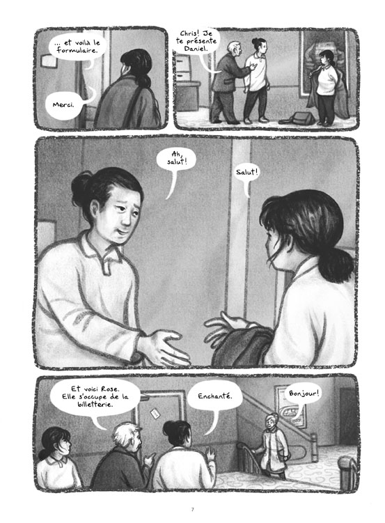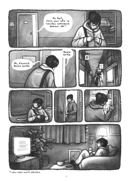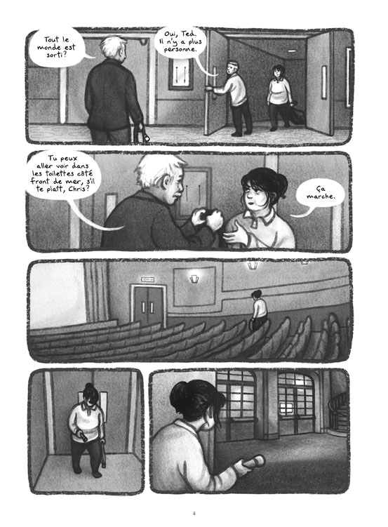 Critique : Nouvelle venue, Katriona Chapman signe ici son deuxième roman graphique - et le premier traduit en français. Elle possède un indéniable sens de l’atmosphère et du rythme justes. Attentive aux situations et échanges du quotidien, elle leur accorde une grande importance, notamment en n’hésitant pas à détailler leur déroulement par une mise en page parfois dense et des cadrages serrés. Le dessin au lavis charbonneux véhicule une réelle tendresse à l’égard des personnages et il peut évoquer celui du grand Tom Tirabosco.
