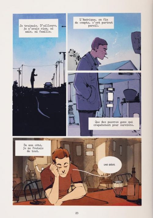 Critique : Sous un trait brut et des couleurs sombres peu contrastées, quasi-camaïeu de brun, rouge, bleu ou vert, se dessine l’histoire peu reluisante d’un écrivain flamboyant. Les chapitres, un pour une tranche de vie, sont entrecoupés de double-pages biographiques documentées, illustrées de photos d’archives.