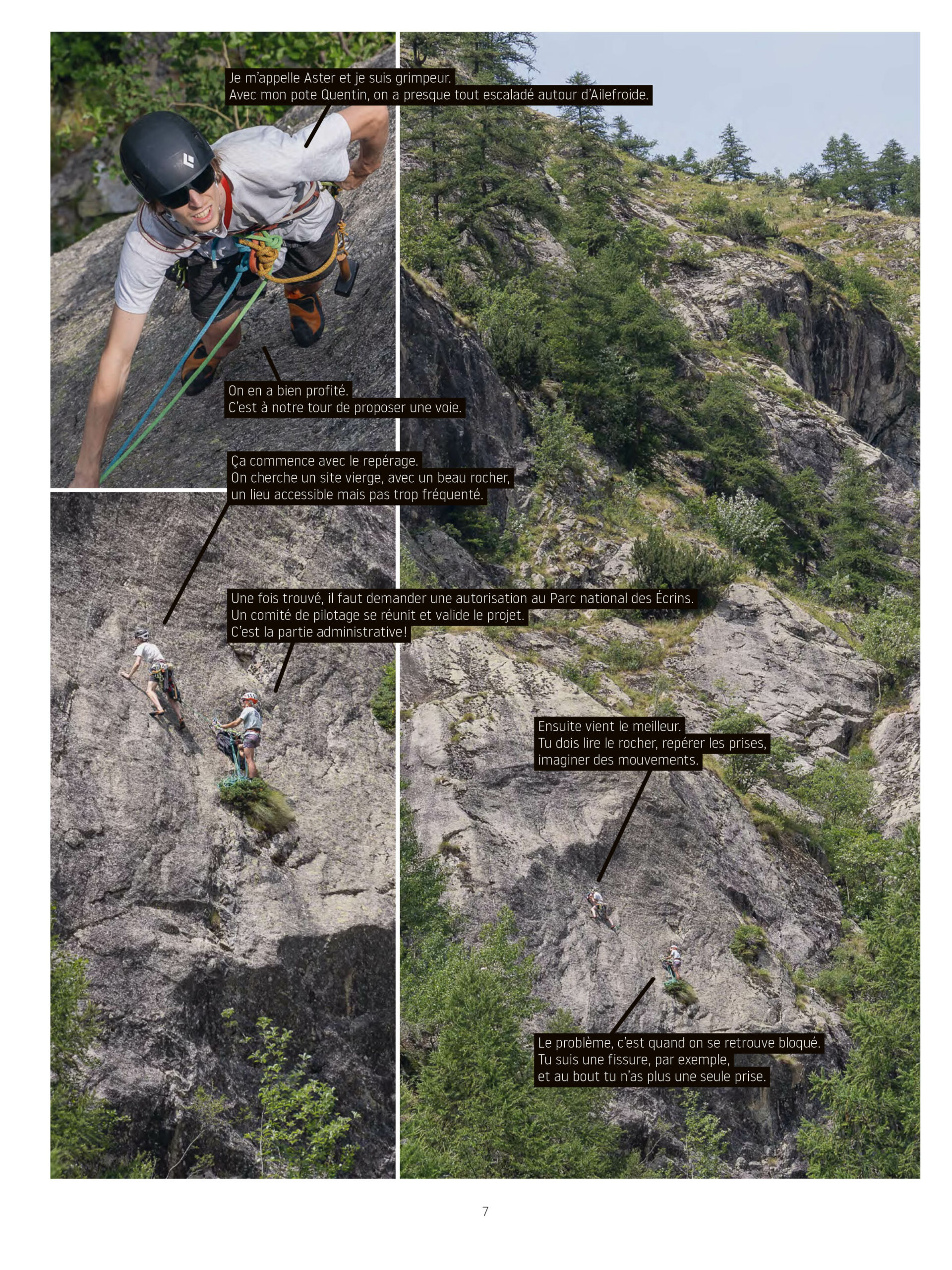 Cette BD-photo ne se contente pas d’aligner des photos en gaufrier, elle utilise les possibilités de la planche pour mettre en avant les scènes d’escalade mais aussi les réflexions d’Aster. De plus, la composition utilisée pour l’étonnant projet de fin d’études vaut aussi le détour. Décors naturels et urbains, les photos couleurs de Xavier Courteix mettent en avant la nature verdoyante autant que la ville grise, qui s’opposent et pourtant se réunissent dans la démarche d’Aster. Le livre se termine avec les crédits, car chaque personnage de la BD est quelqu’un qui a accepté de donner de son temps. De même, Xavier Courteix précise qui l’a aidé pour prendre certaines photos et où sont situés ces photos dans le recueil.