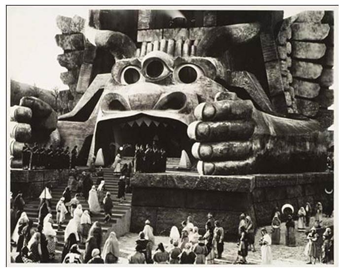 Les didascalies de d’Annunzio sont certes bien emphatiques mais gardent néanmoins une certaine tenue poétique et l’envoûtante Sinfonia del fuoco de Pizzetti, pour baryton, choeur et orchestre, contribue au fort impact de la grande scène du sacrifice au dieu Moloch. Cet épisode, caractérisé par un usage virtuose des inserts (gros plan de la main du prêtre, poing fermé, qui s’ouvre lentement) et un formidable travail sur la photo en clair-obscur rehaussée de virages de couleurs, est indiscutablement un des points d’orgues du film.