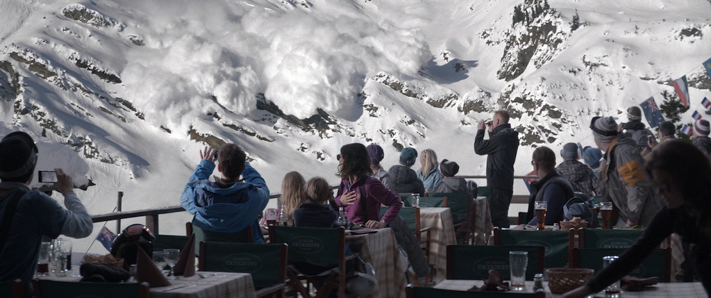 Le film se découpe en plusieurs parties, chacune s’attachant à décrire un journée du séjour, alors que l’unité de la famille se désagrège petit à petit. Le facteur déclencheur, survient au deuxième jour lorsqu’une avalanche gronde et fonce droit sur le restaurant où déjeunent le père, son épouse, et leurs enfants. Face à une situation de danger, l’instinct l’emporte : la femme protectrice couve sa progéniture, l’homme emporte son smartphone, symbole d’un emploi qui ne lui laisse pas de répit, et évidemment de son rang, et, lâche, s’enfuit en courant. Cette manifestation de l’instinct de survie par la couardise va alors ébranler le couple, la famille et même leurs amis, pour le reste du séjour.