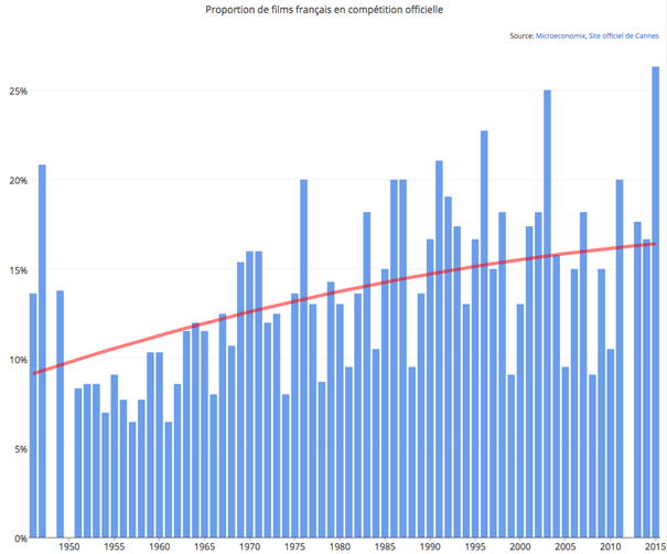 Une compétition officielle de plus en plus française ? Le cabinet spécialisé dans l’analyse de données, Microeconomix, répond à cette critique qui frappe cette 68e édition. Le débat est plus que jamais actuel avec en sélection, en 2015, La Tête haute d’Emmanuelle Bercot (Ouverture), Marguerite et Julien de Valérie Donzelli (Compétition), La Loi du Marché de Stéphane Brizé (Compétition), Mon Roi de Maïwenn (Compétition) et Deepan d’Audiard (Compétition).