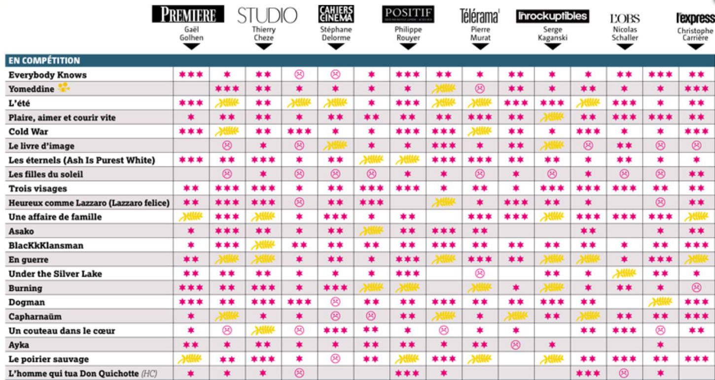 Deux absents regrettables dans ce palmarès, En guerre, de Stéphane Brizé, et L’été, de Kirill Serebrennikov, qui étaient les favoris de la critique française : voir le tableau publié par nos confrères du Film Français ci-dessous...