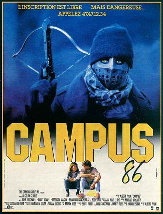 – Campus 86 (Dangerously close : Albert Puyn, remarqué pour son film d’heroic fantasy L’épée sauvage, propose une relecture du film Class 84, plutôt classe et stylé, avec le futur réalisateur John Stockwell dans un rôle de vilain, et la future James Bond girl Carey Lowell. Un produit solide qui ne reste que 3 semaines à l’affiche en août 86 (29.000 entrées France).