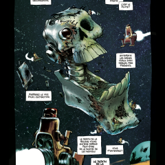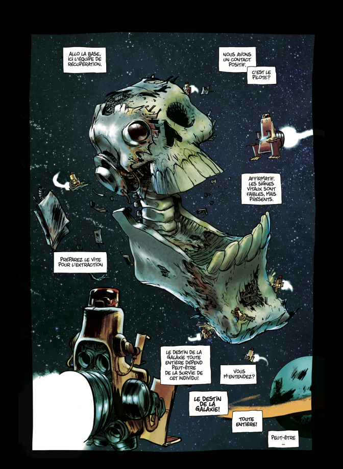 L’Abbé offre un dessin coloré aux aplats éclatants et sait nous entraîner de villes sordides en jungles dangereuses, de cockpits de vaisseaux spatiaux à des planètes sauvages. On prend plaisir à ce graphisme, à ce personnage stylisé en comparaison aux autres humains croisés, moins cartoon. Les histoires, entrecoupées par des moments où l’on retrouve le capitaine en salle d’interrogatoire, prêt à raconter une nouvelle partie de son épopée picaresque, nous étonne toujours, l’Abbé sachant prendre le contrepied de ce que l’on attend.