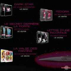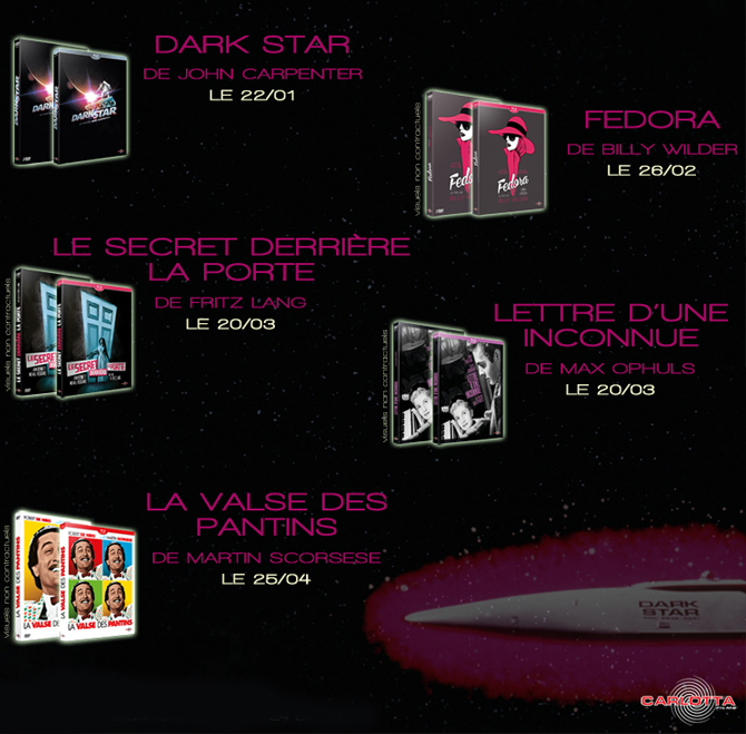Les Français vont enfin pouvoir redécouvrir Dark Star, film de Carpenter méconnu et très rare, de 1974, que l’éditeur proposera en double DVD et blu-ray le 22 janvier prochain. Le film avait été un échec en son temps. Autre étendard des années 70 (et autre bide malheureux), le Fedora de Billy Wilder, inspiré de la vie de "la Divine" Garbo sera également proposé en double DVD et édition blu-ray (le 26/02). En mars, l’éditeur revisite le répertoire de l’Allemand Fritz Lang avec Le secret derrière la porte (1946), film de sa période américaine, qui n’est pas sans rappeler Barbe Bleue dans son intrigue. Le thriller sera disponible en DVD et blu-ray le 20 mars ; le même jour sera édité le magnifique Lettre d’une inconnue de Max Ophuls (1948), avec la regrettée Joan Fontaine, en DVD et blu-ray. Enfin, le flop de Martin Scorsese, du moins en son temps (1983), La valse des pantins, sera proposé le 25 avril (DVD et blu-ray).