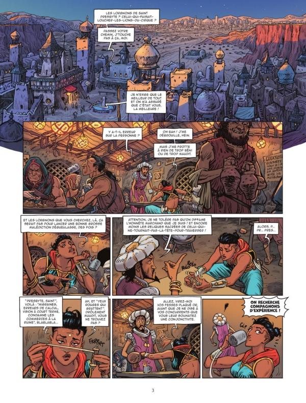 Critique : La mercenaire n’a pas une vie de tout repos, et on comprendra pourquoi au cours de l’histoire. En effet, on ne s’appelle pas Portepoisse pour rien. Ce récit qui avance sur les chapeaux de roue nous entraîne dans un monde où les plus riches lancent des quêtes pour trouver les reliques des multiples saints qui ont peuplé la contrée. Autant d’occasion de missions pour les mercenaires avides de richesses, mais autant de risques de tomber dans des pièges diaboliques. Heureusement pour Carma, elle a un protecteur, un corbeau blanc qui lui délivre des messages lui indiquant ce qu’elle doit faire ou pas pour éviter, enfin, limiter, les ennuis.