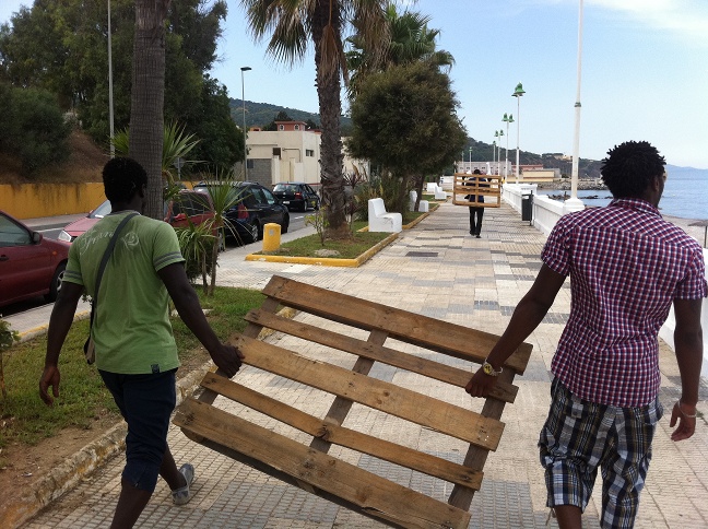 La ville a installé un centre d’accueil temporaire devant lequel flotte le drapeau européen. Les immigrés peuvent en sortir dans la journée, ils sont nourris et on leur donne une paire de sandales à leur arrivée. Ce qui fait dire qu’il s’agit d’une « douce prison ». Pour le reste, ils doivent se débrouiller en ne sachant pas de quoi le lendemain sera fait. Tout en affrontant le racisme quotidien, ils essayent de gagner un peu d’argent en lavant et guidant les voitures, en faisant des petits ménages, en tirant des charges. Ils ne savent s’ils resteront un mois ou cinq ans ici dans cette « prison sans verdict », comme dit l’un d’eux. Avec les quelques euros qu’ils récoltent, ils essayent de maintenir le contact avec ceux qu’ils ont quittés et d’établir des relations avec des immigrés déjà en Europe. Pour tuer le temps, ils errent du camp à la plage, des beaux quartiers du centre ville à la forêt, ils passent des heures à regarder la côte de la « grande Espagne » qui est à une dizaine de kilomètres de l’autre côté de l’eau, ils parlent beaucoup de leurs rêves d’une vie meilleure dans cette Europe, leur Eldorado…