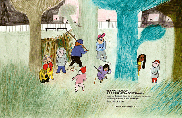 Critique : Ceux qui décident est un livre essentiel qui affronte directement le sujet du harcèlement. L’autrice nous introduit dans une cour d’école ordinaire (elle s’étend au parc, pour des besoins évidents de décors qui abreuvent la narration), et nous place à hauteur d’enfance, pour que nous retrouvions la nôtre et que le jeune lecteur s’identifie immédiatement aux personnages. Ainsi, dès les premières planches l’empathie est grande pour cette bande d’écoliers tout sourire, aux styles vestimentaires hétéroclites et bigarrés, dont la disparité indique des origines sociales diverses et la solidité de l’amitié qui les unit. On se sent alors terriblement démunis, lorsque la bande de « ceux qui décident » - dont les vêtements connotent de manière quelque peu caricaturale la nocivité - les tourmente, les poursuit et finalement leur interdit de s’épanouir dans les jeux qu’ils élaborent. L’absence d’adulte se révèle particulièrement intelligente, car elle implique une résolution de l’histoire par les enfants seuls. La conclusion se révèle alors particulièrement libératrice (autant pour les protagonistes que pour le lecteur) : quand les gredins virent les enfants du terrain de football, ces derniers se rendent compte qu’ils ne sont pas assez pour jouer et leur intiment l’ordre de les accompagner dans la partie. Ils refusent et partent s’amuser au loin. Ce dénouement illustre merveilleusement bien le pouvoir du collectif, qui offre la possibilité de dire non et de ne pas accepter les brimades. Le groupe permet ainsi de se dépasser individuellement, de transcender la gêne ou la honte des persécutions pour oser exprimer la force de son individualité et du désir qui anime la troupe.