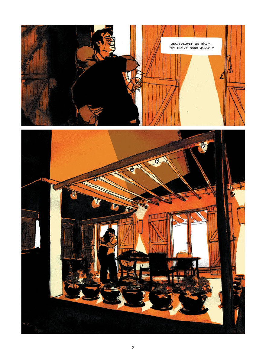 Le dessin de Laurent Bonneau sublime ce récit. Le travail du trait noir crée le contraste avec les zones colorées, et l’encre jetée sur le papier dessine les contours des forme et des visages. Le travail sur les couleurs crée une dominante par lieu, par moment, qui est diluée et crée des zones se mêlant à l’ombre noire. Ces couleurs vives et fortes, du vert de l’abattoir aux oranges de la chambre d’Elisa, sont à l’origine de cet univers visuel qui nous maintient dans l’histoire. Les planches aérées proposent des compositions simples, avec de larges cases, où les émotions passent autant par les visages, les corps que par la couleur. La mise en scène sait prendre le temps des silences lourds de réflexions, se resserrer petit à petit sur un visage. Laurent Bonneau nous offre une belle manière de dessiner et raconter visuellement ce que traverse Fabien.