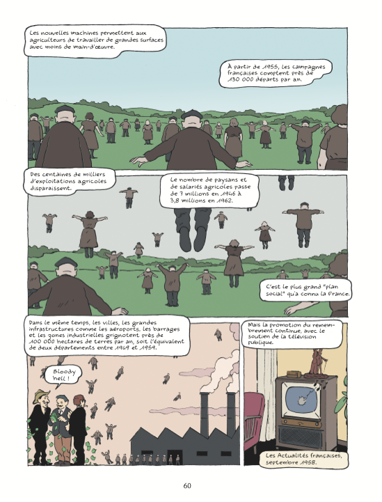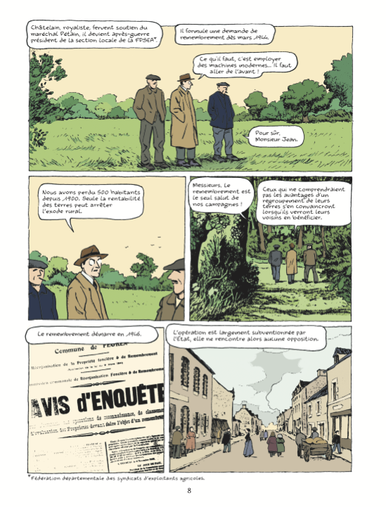 Sur le plan documentaire, l’album s’appuie à la fois sur des témoignages et sur des archives de l’époque (journaux, archives des autorités publiques). Pour sa recherche, Inès Léraud a reçu le soutien de Léandre Mandard, un doctorant en histoire qui – comme la narratrice – constitue aussi un personnage de cette histoire. Le récit alterne avec fluidité entre des séquences de témoignages, qui racontent le vécu des paysans, la violence des événements et les conséquences environnementales sur le terrain, et un récit historique, pour raconter les objectifs de l’État à travers cette opération et les résistances que cela a suscité sur le terrain. On est en particulier frappé par la violence de l’État qui impose par le haut sa volonté à des sociétés paysannes déstabilisées par les enjeux de l’immédiat après-guerre, et le bouleversement radical que le remembrement a instauré dans les campagnes, qui ont été progressivement dévitalisées. On comprend ainsi l’origine de la désertification des campagnes françaises.