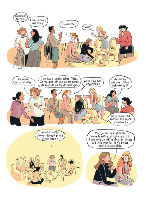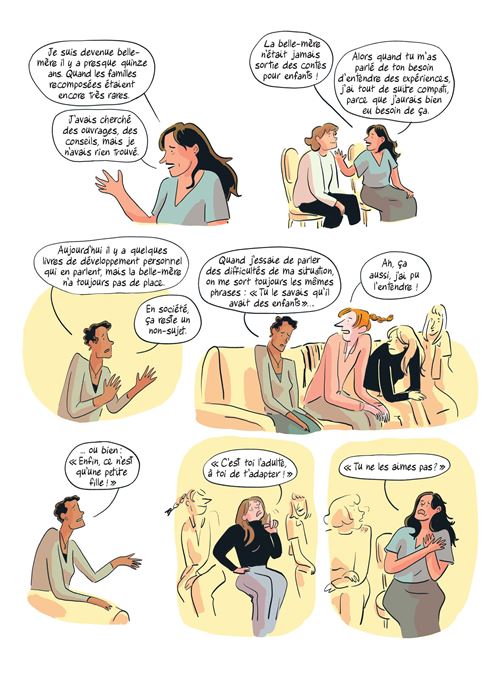 Résumé : Gwenn a rencontré un homme qu’elle aime. Peu de temps après cette rencontre, elle doit changer de logement. Samuel, l’homme en question lui propose de venir s’installer avec lui…. et sa fille. Une perspective à la fois séduisante et effrayante pour Gwenn qui vit seule sans enfant. En quête de conseils elle décide de réunir dans son salon une assemblée de femmes qui vivent ou ont vécu ce rôle de belles-mères. À travers leurs récits, se dévoilent des situations complexes, souvent éprouvantes sans pour autant être dénuée de moments heureux. Toutes montrent combien il est difficile de trouver sa place auprès des enfants de l’autre — ou même auprès des siens dans ces nouvelles configurations — et combien il faut apprendre à jongler avec les attentes, les émotions et les équilibres familiaux.