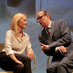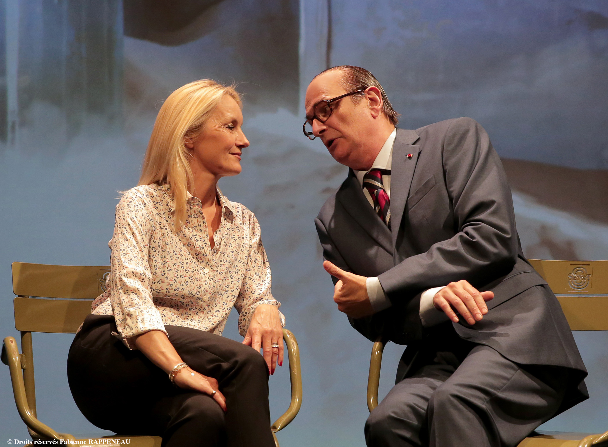 Le voilà qui entre sur scène et d’emblée, la ressemblance avec celui qui inspira un nombre infini de sobriquets tant aux media qu’à ses adversaires politiques, est évidente. La stature imposante, les cheveux plaqués en arrière, les grosses lunettes d’écaille mais aussi la voix, ce phrasé si particulier, cette inimitable prononciation et même la précision des gestes. Marc Chouppart, ex-pensionnaire de la Comédie-Française, est saisissant de vérité. Face à lui Fabienne Galloux se fait mutine, naïve, enjôleuse. Cette bien jolie blonde se prénomme elle-même Valérie (prénom qui, décliné au masculin, ne lui rappelle pas que des bons souvenirs, ne manque pas de souligner l’ancien hôte de l’Elysée). Elle aura tôt fait de réveiller le Chirac séducteur qui sommeille toujours en lui.