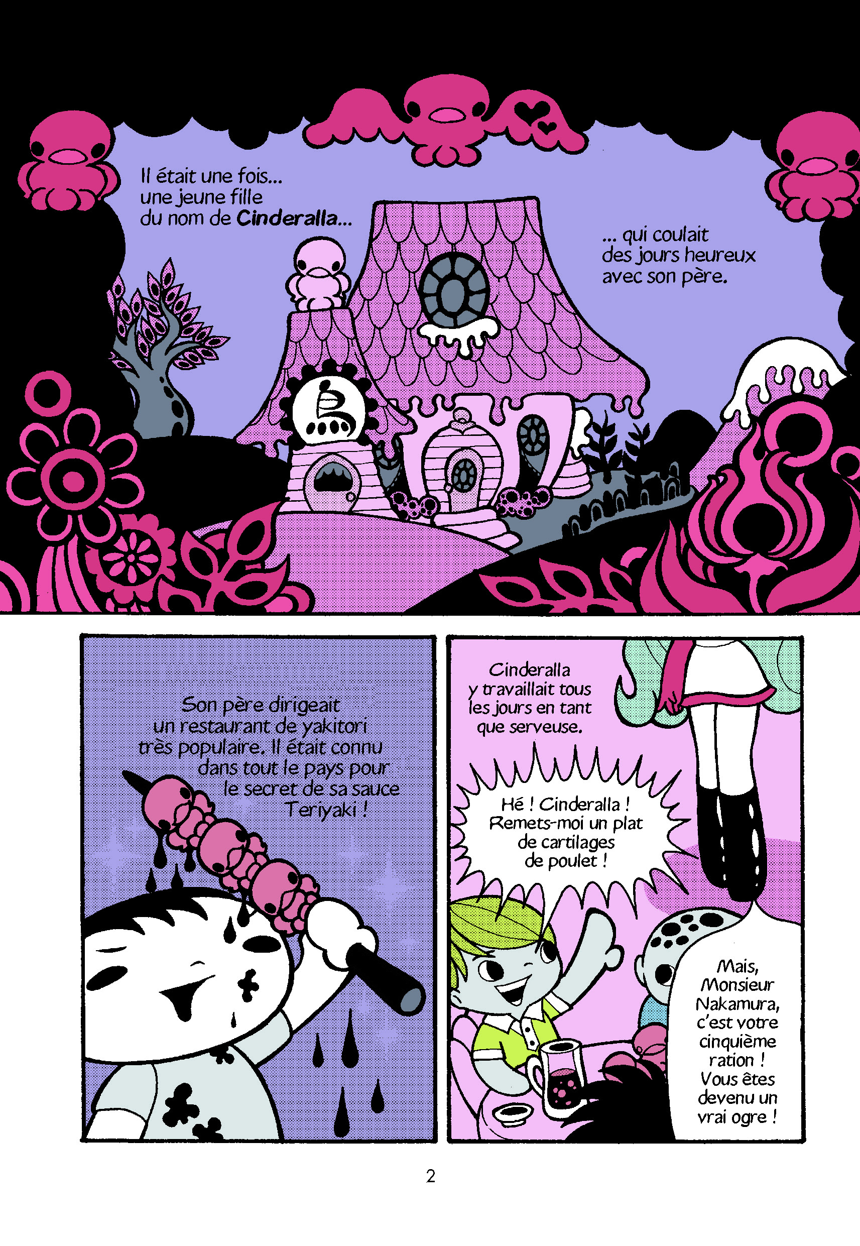 Tout va très vite dans ce récit et si on retrouve les personnages classiques de l’histoire initiale, il y a de nouvelles têtes qui peuvent nous laisser pantois, comme les deux jumeaux ou la petite souris. Le mythe de la bonne fée est également revisitée de manière assez drôle par l’autrice. L’humour et le côté horrifique font bon ménage et on ne peut s’empêcher de sourire aux mésaventures de Cinderalla. Le côté dramatique de l’histoire est désamorcé par ce mélange des extrêmes, on finit même par comprendre les deux belles-sœurs, qui ne sont pas si terribles que ça dans cette version.