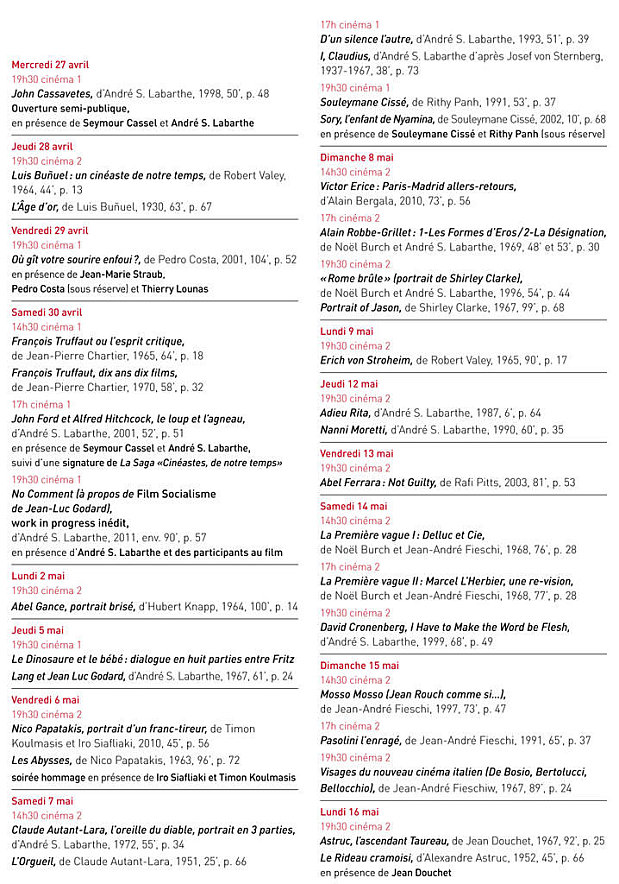 En partenariat avec l’Ina et AMIP, le Centre Pompidou montre cette série dans son intégralité, sur grand écran, en présence de cinéastes filmés et filmeurs, de comédiens et d’invités. Autour d’André S. Labarthe sont réunis : Seymour Cassel, Jean-Marie Straub et Pedro Costa, Souleymane Cissé, les frères Dardenne, Luc Moullet, Olivier Assayas, Julie Bertuccelli et Otar Iosseliani, Chantal Akerman, Alain Cavalier, Bernadette Lafont, Stéphane Audran et Thomas Chabrol...