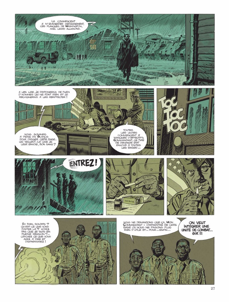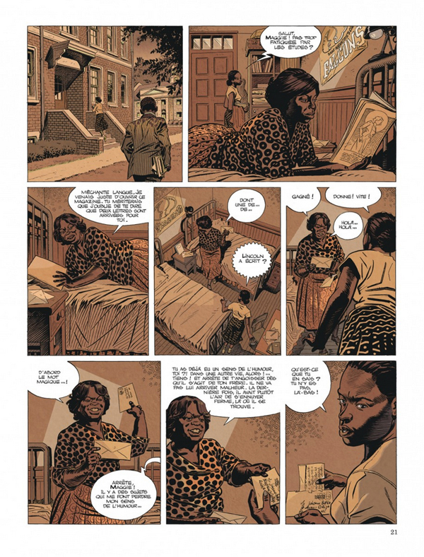 Cette bande dessinée, qui traite du racisme et de la ségrégation, le fait d’une manière à la fois historique et mythique. Sorte de mélange entre Monument Men et la Couleur des Sentiments, Cinq branches de coton noir a tout d’un film, qui pourrait être aussi bien indépendant que hollywoodien. De l’action, de la recherche historique, du patriotisme, de la sociologie... chaque force se répand et se croise dans un récit qui lui aussi joue sur les narrations et les époques. L’ouverture d’un journal, authentique, est chevauché par la correspondance entre le frère et la sœur, tous deux militants pour un pays plus juste. Les reproches, les menaces et les offenses viennent en effet davantage de leurs compatriotes que des Allemands ou Japonais, contre qui le pays est pourtant en guerre. Autour du drapeau américain, créé à Philadelphie, va se nouer des destins. De fait, si une petite accroche typique du cinéma d’outre-atlantique avait prévenu « Cette bande dessinée est inspirée de faits réels », le lecteur n’aurait eu aucun mal à le croire, tant cette œuvre paraît authentique et son histoire réaliste.