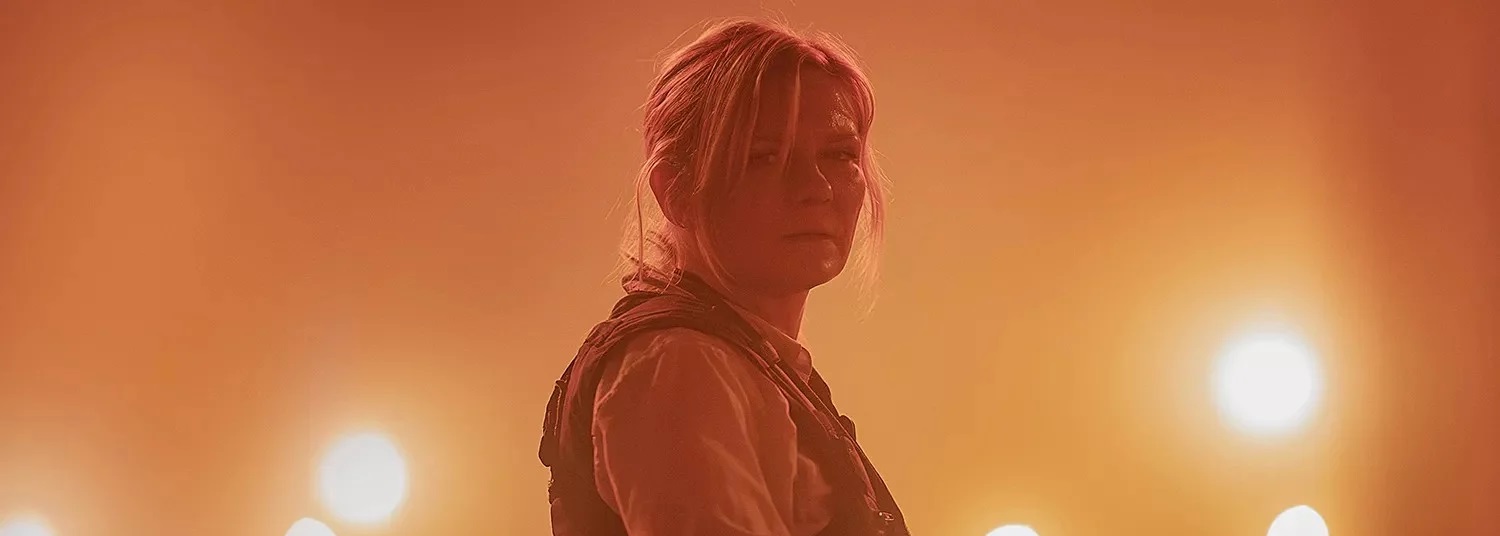 Il y a d’abord le personnage de Lee, interprété par Kirsten Dunst, photographe de guerre à l’aura légendaire, dénuée d’émotions et hantée par toute son expérience de reporter de terrain de par le monde, commençant à s’interroger sur sa propre éthique et l’essence même du pouvoir de l’image. En face se trouve Jessie, jeune ingénue fraichement débarquée, incarnée par Cailee Spaney, probablement le personnage le plus passionnant du film, agissant comme une boussole morale aux yeux de Lee. Ces deux personnages complémentaires vont connaître une évolution inversée. Tandis que Lee essaie de figurer la violence et d’exorciser son mal-être existentiel quant à sa responsabilité de journaliste, Jessie devient ce que Lee voulait fuir : quelqu’un d’insensible et d’hermétique à la compréhension du monde qui l’entoure, se fourvoyant dans une imagerie sensationnaliste et apolitique. Jessie n’a de cesse de s’enfoncer dans l’abîme tout du long de son odyssée mortifère. Elle qui était incapable de sortir son appareil photographique face à deux hommes torturés et pendus à l’arrière d’une station-service, devient peu à peu une figure mutante et déshumanisée, la caméra braquée contre son crâne, le regard du diaphragme ayant définitivement pris la place de l’œil humain. Le regard de Jessie devient le cœur névralgique du film. Son obsession ineffable semble être de capturer une vérité, d’atteindre une sorte de quintessence dans la mort et l’autodestruction, allant même jusqu’à risquer sa vie pour le perfect shot. D’ailleurs, Alex Garland choisit de représenter la guerre à travers le cliché photographique pris par le personnage, apparaissant dans le montage du film comme un moment subliminal suspendu dans le temps, presque éthéré, où le silence assourdissant peut parfois constituer un contraste saisissant avec la fusillade ayant lieu dans le réel. Tout le projet thématique du film réside dans cette confrontation de points de vue salvatrice entre les deux personnages symboles de Lee et Jessie : tout les pousse à enregistrer et documenter la guerre, sans comprendre ni rien saisir de ce qu’ils filment, et, osons aller plus loin, en brouillant les éléments qu’ils essaient de capturer sur le vif. Le long métrage devient à ce moment-ci un pur voyage sensoriel sur la ruine de l’âme et l’annihilation de l’individu.