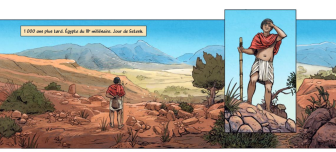 Pour le dessin, un travail d’accord historique a certainement été à l’oeuvre, pour coller au plus près non pas tant aux habitudes vestimentaires et aux coutumes religieuses, mais davantage aux épisodes mythologiques, aux représentations divines et à leurs symboles. Ainsi, une couleur ou une arme a une portée qui est plus large que juste être rouge ou un couteau incurvé, et chaque planche peut à la fois se présenter comme une esquisse d’un paysage ou portrait tiré de l’Égypte il y a plus de quatre mille ans, ou bien se voir comme une représentation allégorique de passages mythiques où un faucon vient combattre un chien sauvage sur les rives du Nil, sans que l’on soit par ailleurs perturbé par cette dualité tout au long de l’album. D’ailleurs, là où la Crète jouait sur le faux semblant du mythe en recherchant une cause réelle, Égypte propose une lecteur mythologique aux évènements historiques et leur donne un un calque fantasmagorique.