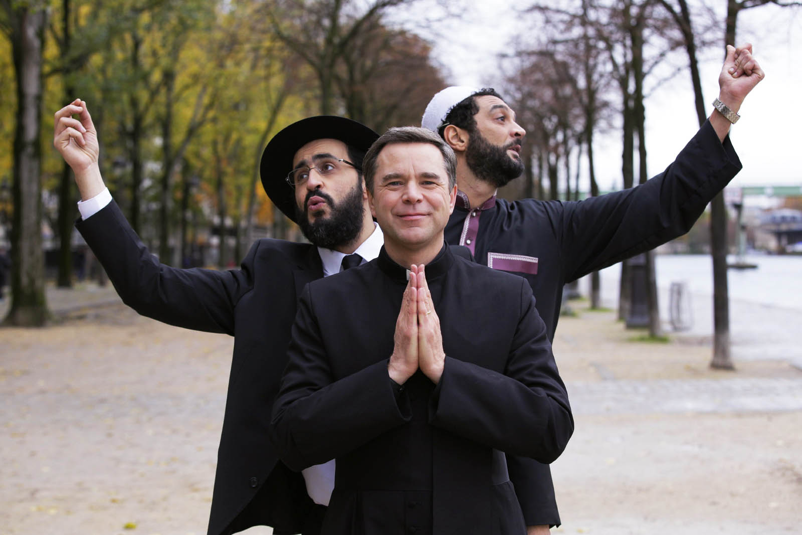 Ce groupe musical dépareillé composé de Guillaume de Tonquédec dont la soutane de curé lui accorde une allure de brebis innocente et à qui l’on « donnerait le Bon Dieu sans confession » ; Ramzy Bedia hilarant en ex-chanteur de raï raté transformé pour la circonstance en imam improvisé, épicurien et antisémite, irrésistiblement attiré par le saucisson, l’alcool et les filles faciles ; tout l’opposé de Jonathan Cohen, rabbin autrefois idole des bar-mitsva, devenu maître dans l’exercice de la déprime suite à une circoncision loupée, vivant entre exaltation incontrôlable et abattement sans fond ; il est managé par un producteur désabusé (Fabrice Eboué) et son assistante plus désespérée de solitude que réellement nymphomane (la malicieuse Audrey Lamy). Le tout surfe avec allégresse sur les oppositions entre les trois religions les plus représentées en France. Un joyeux prétexte pour dénoncer le cynisme partout présent, tant dans le monde du divertissement, qui préfère la quantité à la qualité, que dans celui de la spiritualité trop souvent utilisée pour crisper les sociétés du monde entier à des fins politiques ou guerrières plutôt que d’élever l’âme des croyants. Adoptant un ton satirique bien plus que moralisateur, le dialogue envoie sans répit réparties osées et blagues impertinentes, insufflant une énergie réjouissante à cette farce pleine de gaîté.