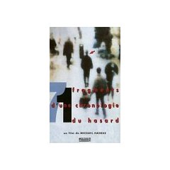 71 fragments pour une chronologie du hasard anticipe et prend à rebours un certain cinéma américain pervers et faussement critique (Magnolia, Donnie Darco) où le hasard des destins croisés est prétexte à un lyrisme aussi pontifiant que risible dans ses déclarations humanistes. A l’inverse, le hasard de Haneke ne fait aucun compromis avec une réalité que le cinéma doit montrer, plus qu’il ne doit offrir les moyens commodes et élégants de s’en évader. Ainsi de longs extraits (bien réels) de journaux télévisés tout le long de 71 fragments... font la preuve que la guerre est partout. Ainsi cette médiation télévisuelle et imbécile, mais surtout tellement miraculeuse, fait croire que cette guerre a toujours lieu ailleurs, dans une sorte de hasard géographique. Heureusement - malheureusement... - le cinéma est là pour rétablir la vérité : la guerre a lieu ici et maintenant, elle n’a rien à voir avec le hasard, et ne vous illusionnez pas trop longtemps : vous avez peu de chance de lui échapper. Comme le prouve le fait divers sur lequel est construit le dispositif des 71 fragments pour une chronologie du hasard.