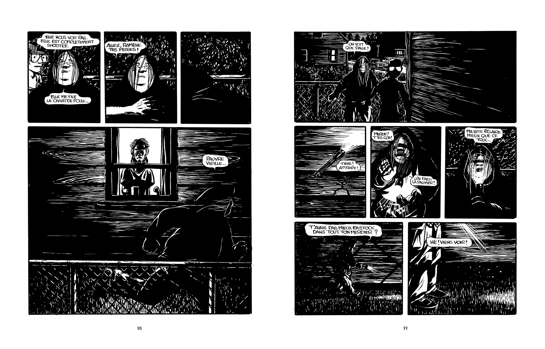 En revanche, Inker investit un genre qu’il n’avait jusque là pas exploré : le polar teinté d’horreur. La découverte du corps dévoré d’un adolescent constitue le fil rouge d’une histoire qui met en scène un tueur – ou plutôt devrait-on dire un monstre – on ne peut plus inquiétant. En cherchant à le confondre, la petite bande prend le risque d’attirer l’attention du criminel… Un sentiment d’angoisse diffus remplit progressivement les personnages et les planches du récit. Inker excelle dans la mise en scène morbide et dans les effets de contraste permis par le noir et blanc.