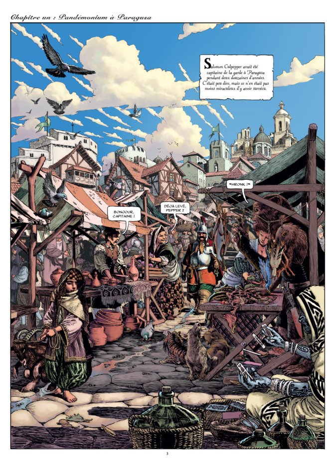 Entre Dumas et Les Annales du Disque Monde, on sent que les créateurs de la série Marshall Bass se sont fait plaisir lorsqu’ils ont couché sur le papier les aventures du sergent, ou plutôt capitaine, Pepper et de son neveu Colt. On pense à l’influence des mousquetaires dès la couverture, mais très vite c’est le cycle de la Garde de Terry Pratchett et son capitaine Vimaire qui viennent en tête, à la façon notamment dont le soldat flâne entre commerçants trolls, crabes géants pirates et bourreaux Vishnou.
