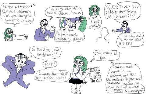 Mais la dessinatrice défend aussi les hommes qui pleurent (« Ravale tes larmes ou t’es pas un homme ! »), les homos (« Hey sale PD ! »), les obèses (« qui bouffent à longueur de journée ») et la cerise sur le gâteau : les handicapés (« il est handicapé mais il est super gentil, tu verras ») … tous ces petits clichés de la pop-culture matraqués dans notre inconscient collectif à longueurs de pages, d’ondes et d’écrans.