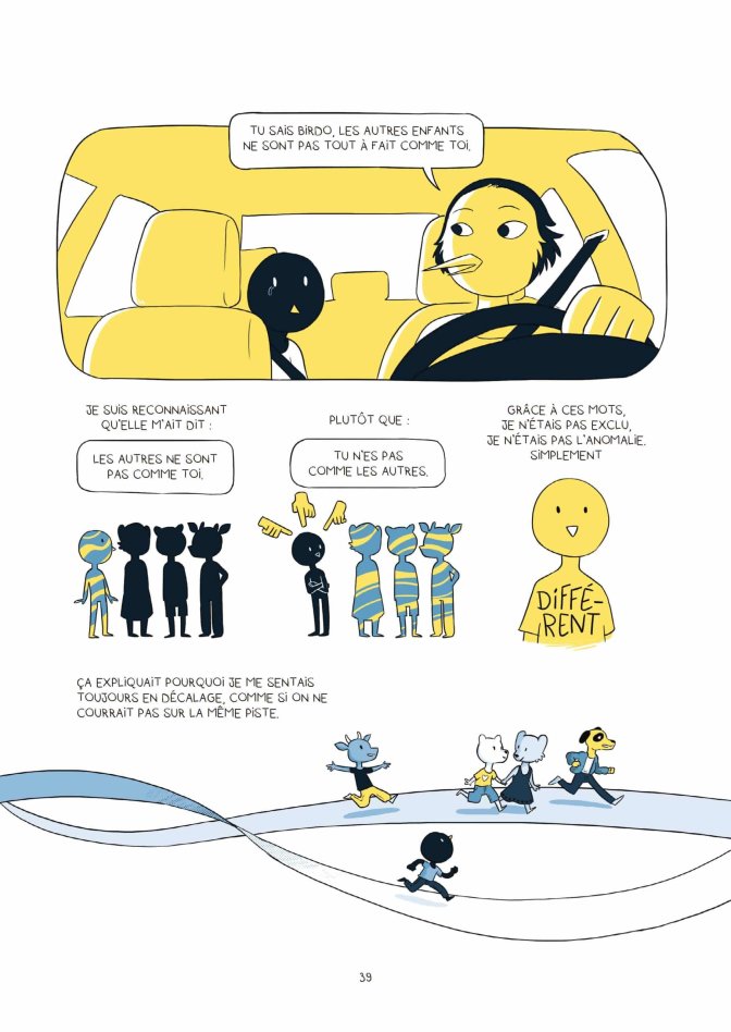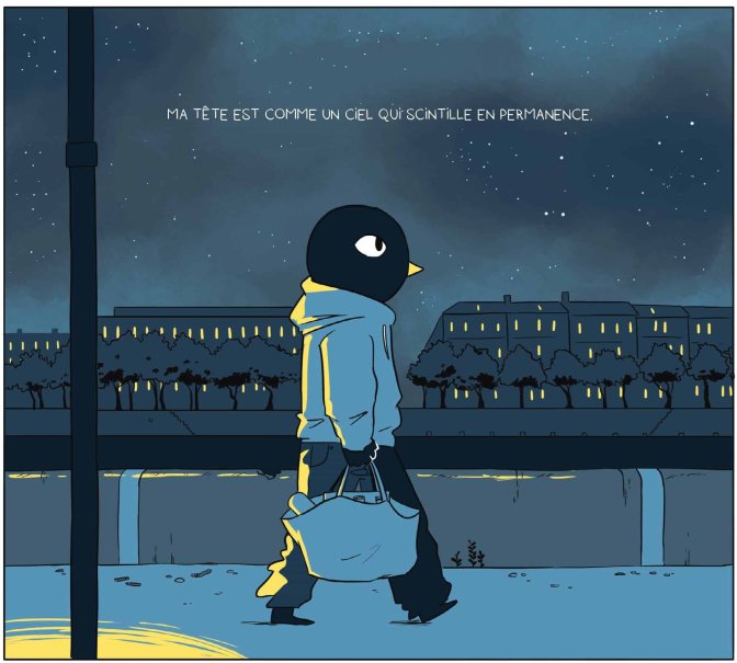 Sur le plan graphique, le style de Lou Lubie repose sur une certaine simplicité. Irriguées d’un bleu un peu mélancolique, les pages font vivre le quotidien de Birdo, un cuisinier qui alterne le génialissime et le défaitisme dans un réel propre à une génération, un peu perdu et souvent à la peine. Lorsqu’arrive Raya, c’est un rayon de soleil jaune qui s’impose dans cette nuit, mais avec son lot d’interrogations, de doutes et de révélations qui coulent peu à peu pour informer le lecteur. Cette réalité se dilue dans un tableau exhaustif des avancées, des études qui jalonnent la définition de surdoué, graphiques et schémas venant donc d’une manière efficace se greffer au roman graphique de Birdo et Raya, prétexte à cette vulgarisation scientifique.