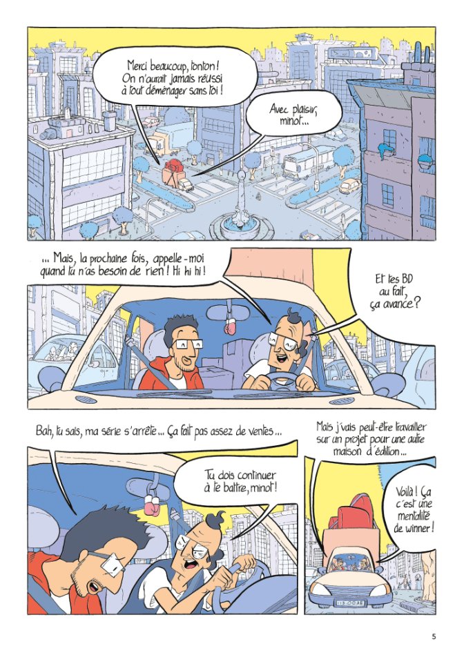 Ce seront donc des planches de bandes dessinées que viendra la catharsis. Pour le dessinateur de Nas, poids plume, si le côté humour et enfantin semble d’abord abandonné, il y a cependant une profonde respiration dans le style, qui joue sur des émotions fortes, longtemps contenues et qui se réveillent. Les tranches de vie personnelle viennent casser les personnages sans traits aux couleurs différentes (rouge, bleu, vert), sortes de bonhommes de jeux de société qui donneraient vie aux théories et concepts que l’histoire et la sociologie ont inventés. Pour la vie personnelle, c’est un rendu un peu timide, puis qui comme le personnage s’ouvre peu à peu, laissant place à la compagne, l’enfant à venir, la famille aussi…