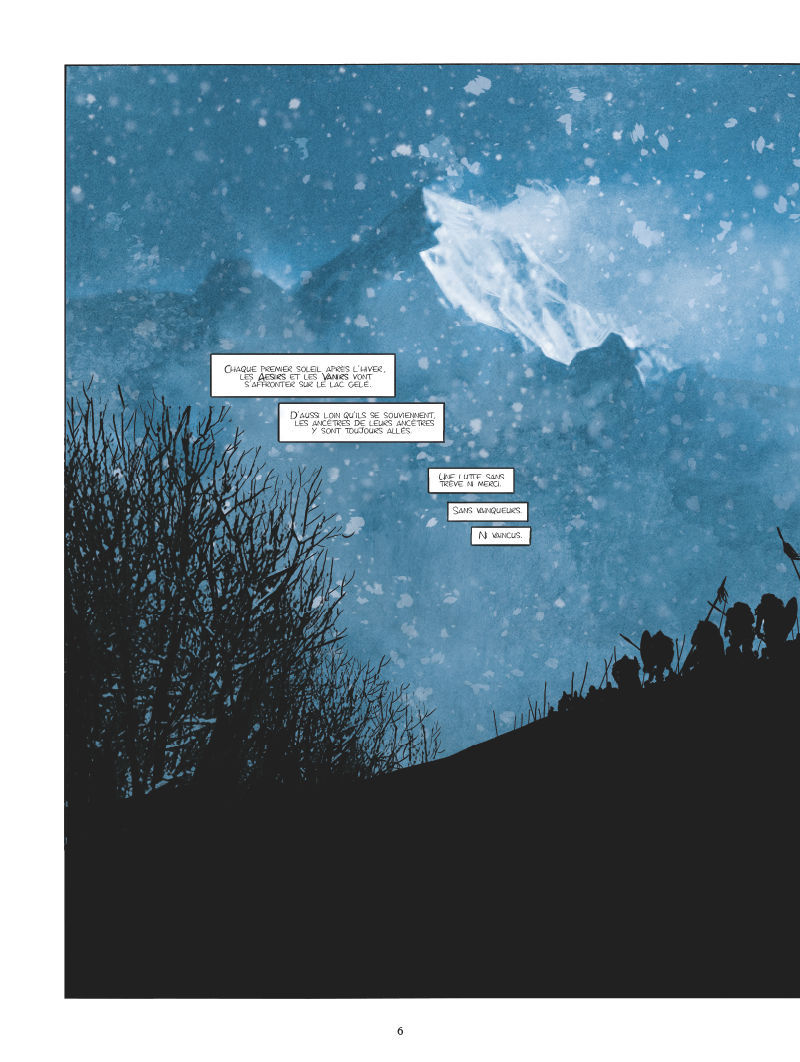 Mais la principale prouesse de Robin Recht est graphique. De magnifiques doubles pages sur le paysage montagnard scandent le récit. Le travail de mise en couleur est extrêmement réussi. Le dessinateur joue parfaitement sur les contrastes entre la neige, la chevelure de la fille du géant du gel et le sang des combattants. Souvent aperçu en contre-plongée, Conan apparaît lui-même comme un géant sombre et inquiétant qui n’obéirait à aucune autre loi que la sienne.