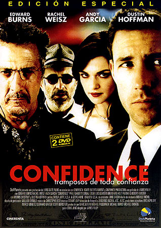 Notre avis : Beau gosse d’escroc, agent du FBI tenace, caïd psychotique, femme fatale, meurtre et flics véreux, James Foley livre avec Confidence une énième variation sur le thème de L’arnaque, le chef-d’œuvre de George Roy Hill (1973). Le scénario part sur les mêmes bases du gentil voleur qui escroque, sans le savoir, un méchant caïd. Ce dernier réprime méchamment (eh oui, c’est son métier d’être méchant) en tuant l’ami du gentil voleur qui se venge à son tour. Ouf, justice est faite. Heureusement l’objectif de Confidence n’est pas l’introspection du genre humain mais davantage un jeu de cache-cache dont la mise en scène rythmée amusera sans doute un spectateur désabusé. En guise d’escroc gentleman, Edward Burns oppose son joli faciès à celui, plus usé, d’un Dustin Hoffman jubilant de violence gratuite et obsessionnelle. La structure narrative non linéaire (le film commence à la fin pour revenir au récit de Jake), les rebondissements amenés par des dialogues quelquefois drôles font de ce Confidence un chuchotement plus plaisant à entendre qu’à regarder.