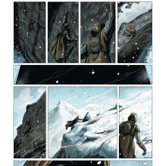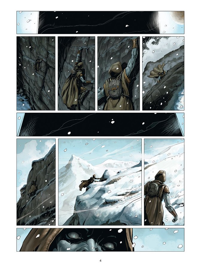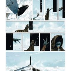 Comme la série Androïdes s’était arrangée pour proposer aux lecteurs quatre one-shot sur les possibilités d’un futur plutôt désastreux au côté des Intelligences artificielles, la série Conquêtes offre les possibilités de l’exploration et de la colonisation spatiale. Cinq tomes concernant cinq planètes différentes, et donc autant de protagonistes et d’écueils à prévoir en perspective. Pas de liens, sinon l’envie de couvrir l’éventail de scénarii, quitte à ressembler à quelques classiques SF. En choisissant la neige, Islandia faisait dans l’original, puisque peu de BD avait déjà envisagé d’y intégrer une histoire en entier. Il faudrait plutôt chercher dans les jeux vidéo, avec une ambiance Lost Planet ou Dead Space 3, voire StarCraft avec des aliens façon Protoss. Pourtant l’essentiel est ailleurs, résidant plutôt dans cette flotte aux couleurs, symboles et habitudes très dictatoriales, des marines costauds et fidèles et des généticiens privés qui font penser à la franchise Alien. Pour le scénario, là encore l’influence serait plutôt d’un univers à la Silverberg ou un gamer, tolérant une liberté, des péripéties bien amenées, un déroulement qui semble linéaire mais qui a en fait pas mal d’écarts surprenants.