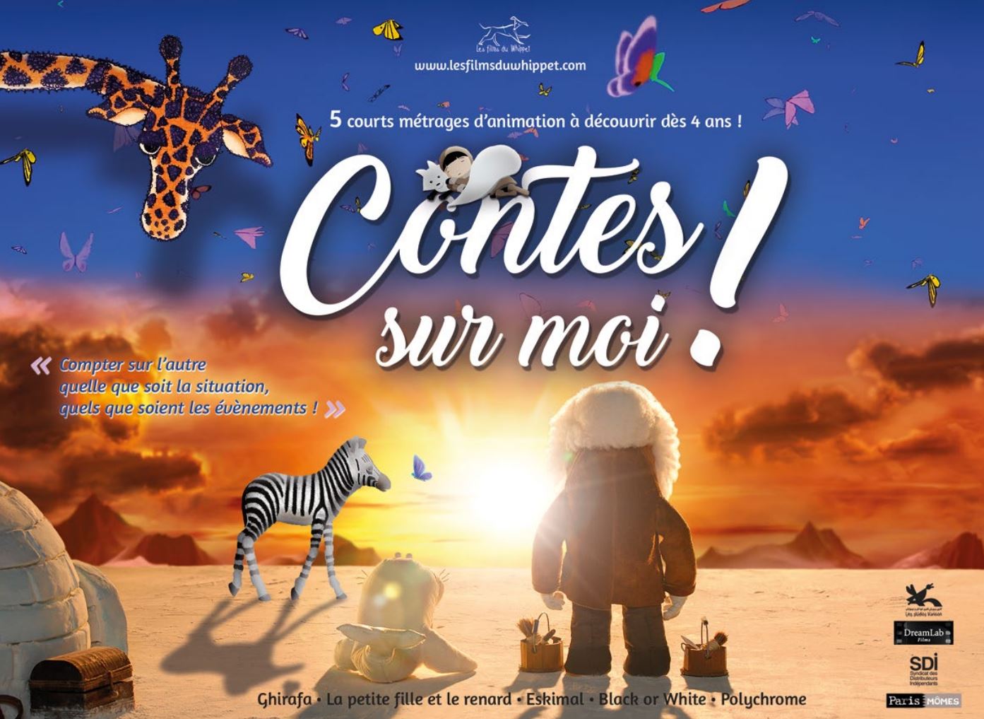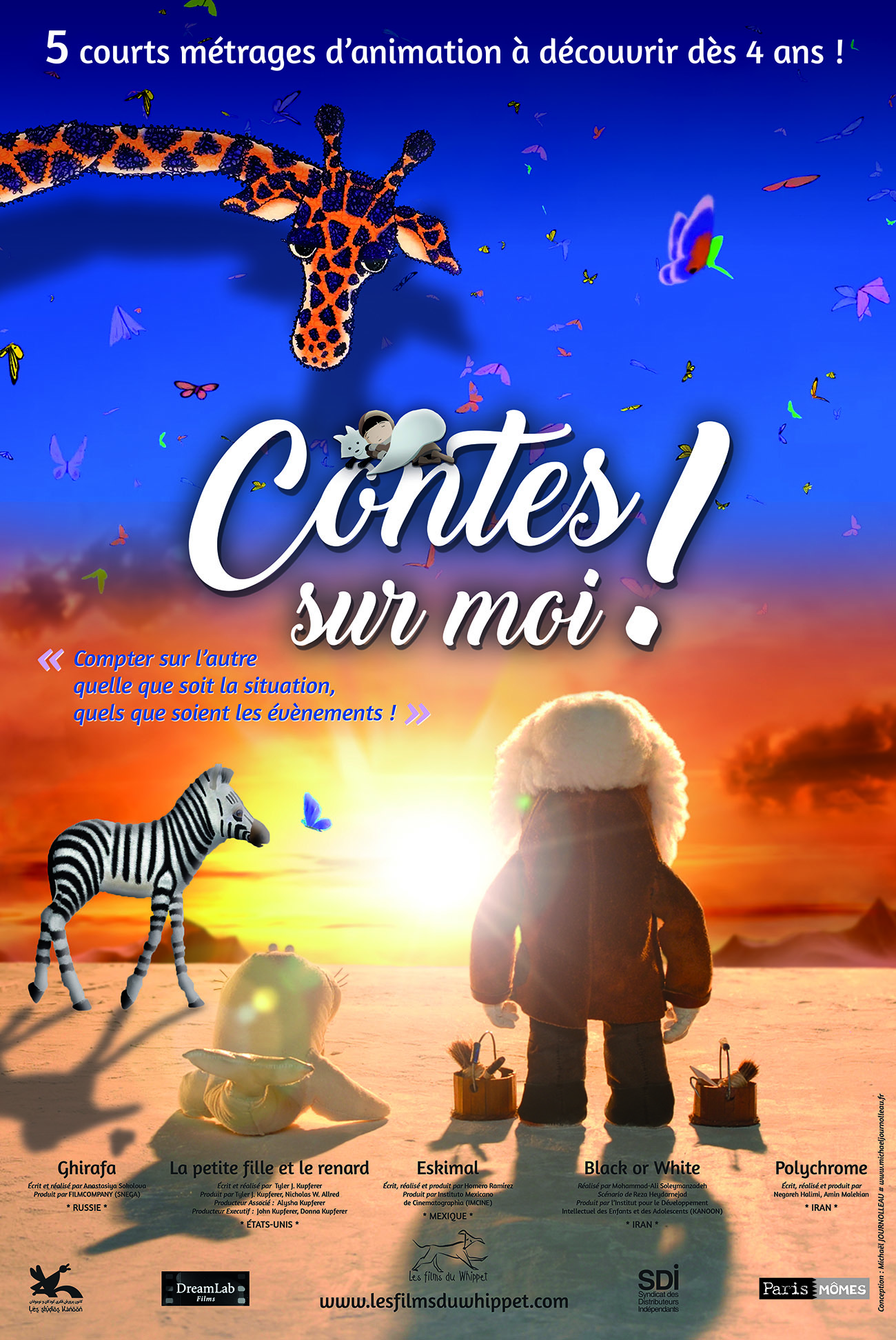 Résumé : Programme de 5 courts métrages à découvrir dès 4 ans « Ghirafa » de Anastasiya Sokolova (Russie) « La petite fille et le renard » de Tyler J. Kupferer (USA) « Eskimal » de Homero Ramírez (Mexique) « Black or White » de Mohammad-Ali Soleymanzadeh (Iran) « Polychrome » de Negareh Halimi (Iran) Compter sur l’autre, quelle que soit la situation, quels que soient les évènements ! Animation : papier découpé, animation numérique, dessin animé, marionnettes animées, stop motion