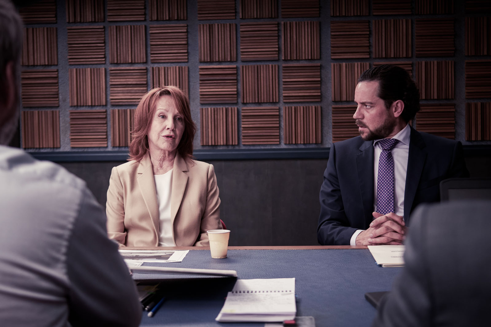 Le concept ? Une série d’anthologie consacrée à des gardes à vue et des interrogatoires. Sur le papier, a priori, cela ne peut être qu’intéressant, quand bien même le cinéphile averti viendrait rappeler que depuis Garde à vue (1981) de Claude Miller, avec ses quatre César, la barre est plus que haute. Justement, on va la relever la barre, avec la contrainte du genre et une mise en scène idoine, puisque tout se passera exclusivement en huis clos. Pour être plus précis, uniquement dans quatre décors, pas un de plus : la salle d’interrogatoire, l’autre salle derrière le miroir, le bout de couloir pour passer d’une salle à l’autre, et enfin le palier de l’étage avec un simple escalier, un distributeur de boissons et friandises, la porte de l’ascenseur, et une baie vitrée donnant sur un paysage urbain moyennement palpitant. Unique point d’entrée du jour ou de la nuit, les autres décors étant aveugles. Autant vous prévenir : vous ne prendrez jamais l’air !