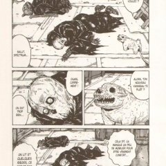 Cette douce folie que représente le dessin d’Hayashida continue de faire son petit effet : sans jamais être totalement gore ou horrifique, il propose du massacre drôle, une barbarie comique qui ne peur s’empêcher de repartir à chaque fois dans un gothique spatial, comme si Poe avait croisé Rabelais pour faire une partie de Warhammer. Tantôt sérieux et souvent acerbe, le ton se marie avec ces planches très noires où les os sont omniprésents, où les membres surgissent et sont découpés sans que l’on ne s’en plaigne, et très vite on attend le moment où cette violence va éclater, un peu comme l’on est devant un film de Tarantino.